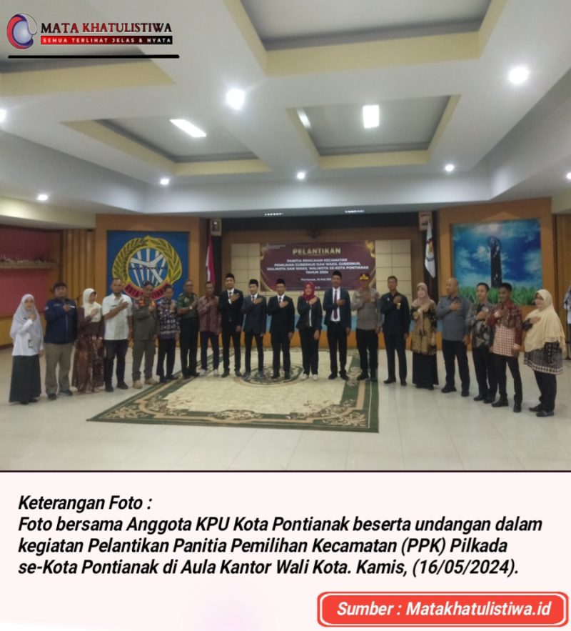 Matakhatulistiwa.id – Pontianak. Komisi Pemilihan Umum Kota Pontianak menggelar pelantikan Panitia Pemilihan Kecamatan (PPK) se-Kota Pontianak. Sebanyak 30 Anggota PPK dari enam (6) kecamatan yang dinyatakan lulus tersebut dilantik KPU Kota Pontianak di Aula Kantor Wali Kota Pontianak. Kamis, (16/05/2024).