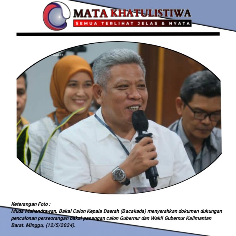 Mata Khatulistiwa – Pontianak. Keseriusan Muda Mahendrawan maju di Pilkada Kalbar tak di ragukan. Mantan Bupati Kubu Raya dua periode itu menunjukan dirinya serius maju di Pilkada Kalbar melalui jalur independen. Hal itu ia tunjukan saat ia bersama bakal pasangan calonnya Suyanto Tanjung. Menyerahkan Persyaratan Dukungan Bakal Pasangan Calon Perseorangan ke KPU Provinsi Kalbar. Minggu, (12/5/2024).